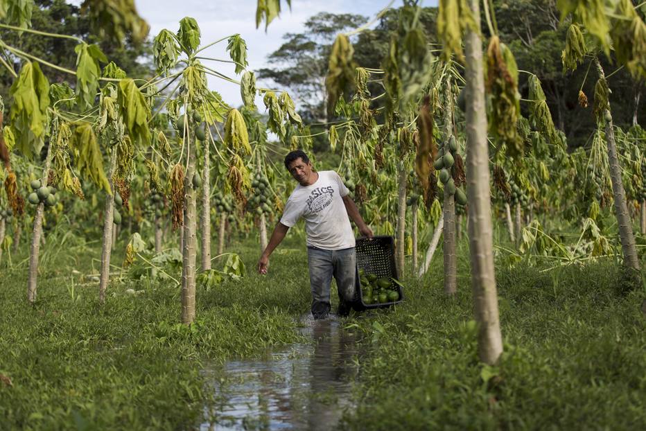 Jander Santos de Souza (D) passa por sua plantação de milho que foi inundada com a cheia do Rio Solimões, na zona rural do município de Manacapuru, no Amazonas