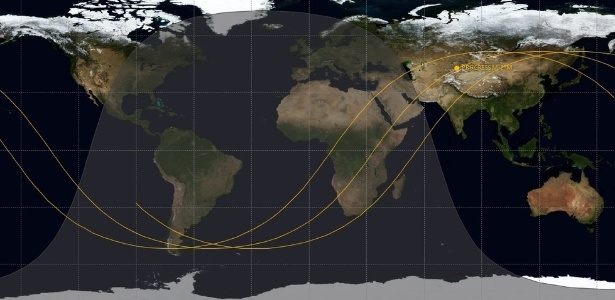 | As linhas amarelas representam os locais onde a nave cargueiro russa pode cair nesta quinta-feira (7) |